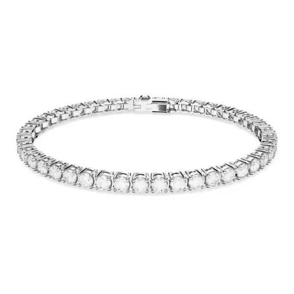 • Piedras: Está adornada con una fila de cristales Swarovski blancos redondos, engastados individualmente para maximizar su brillo Cuenta con un cierre de lengüeta con un bloqueo de seguridad para garantizar un ajuste seguro