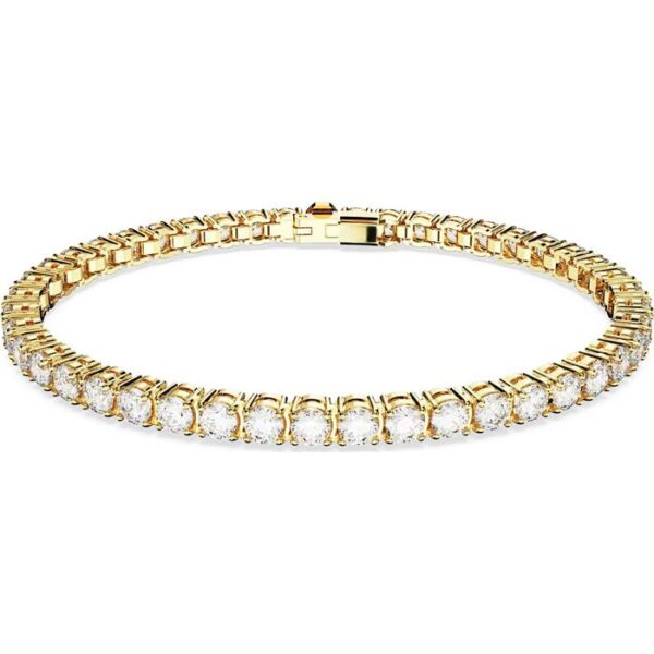 Pulsera Swarovski Matrix Tennis baño de oro y cristales Swarovski, fabricada con una aleación de metales bañados en oro compuesta por cristales blancos en talla circular engastados en cuatro garras. Con cierre de caja