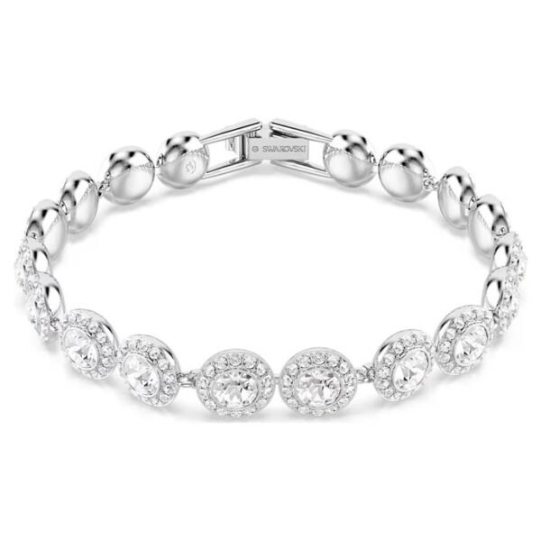 Pulsera Swarovski de la colección Angelic , caracterizada por eslabones individuales con un cristal central engastado y un halo de cristales más pequeños alrededor. Acabado Baño de rodio para un acabado plateado y duradero. Cierre plegable que ofrece un ajuste seguro.
