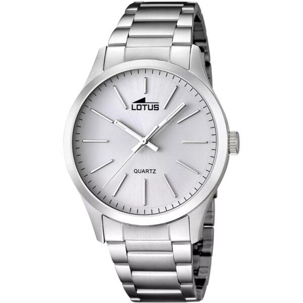 Reloj Lotus de la colección Minimalist. Caja redonda de 45mm de diámetro. En acero, esfera blanca, índices y agujas plateadas. Brazalete de acero con cierre desplegable. Resistente hasta los 50m. Garantía de 3 Años
